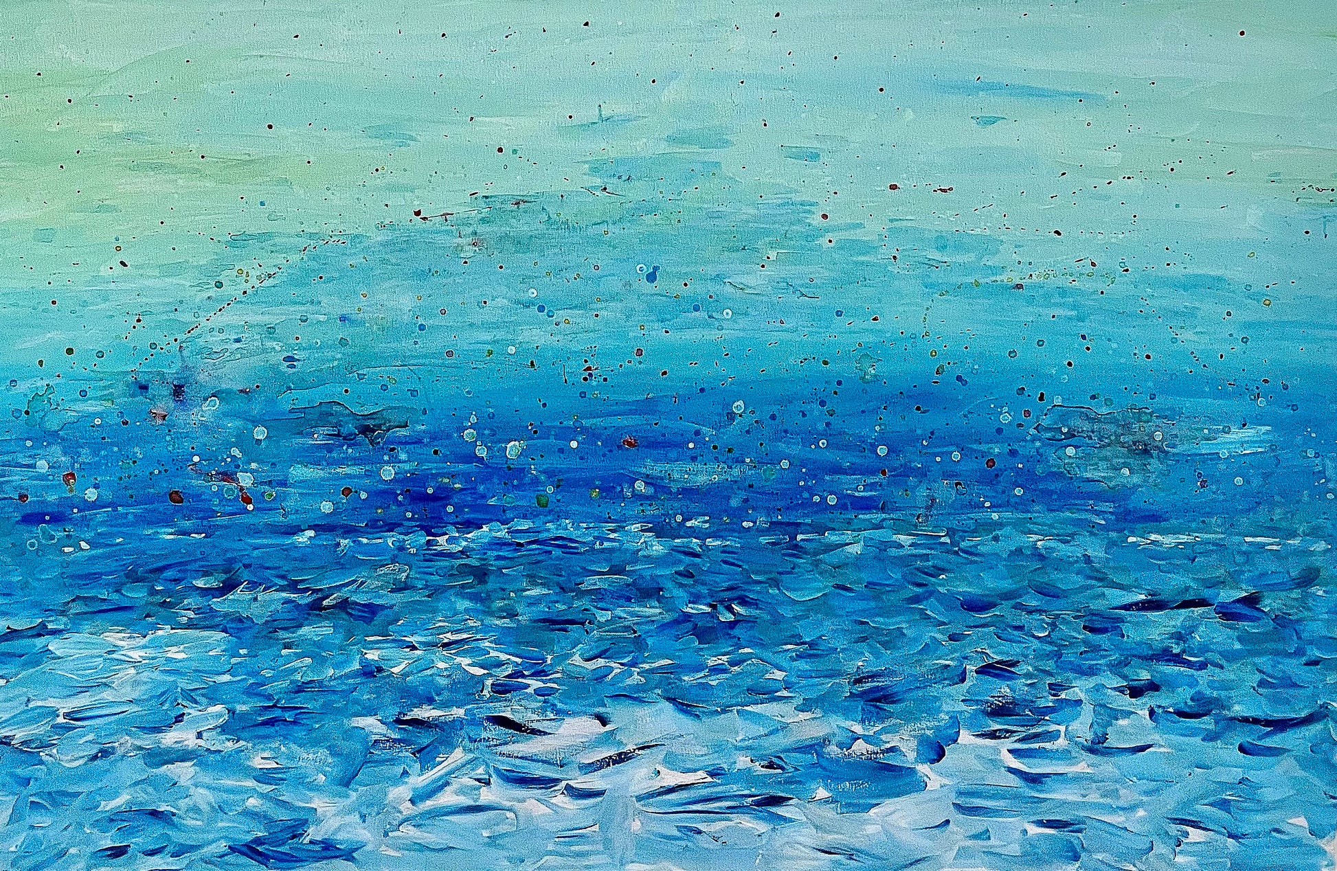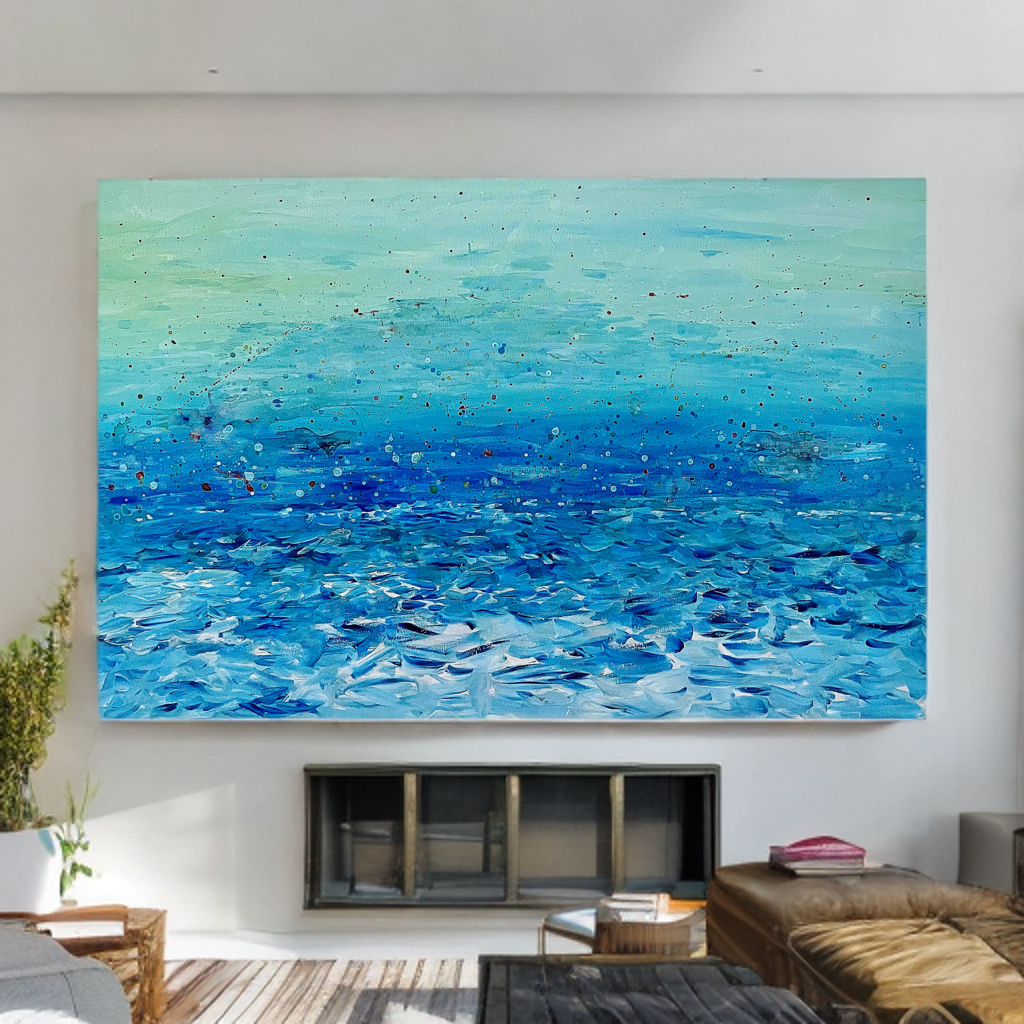The painting captures the feeling of being one with the seaβ€”riding waves, floating, or simply letting the water hold you. It is a reflection of belonging: the sea welcomes without borders, blurring lines between water and sky, horizon and infinity. From certain angles, the Terrazza Mascagni’s flooring emerges subtly beneath the waves, a nod to the proudly Tuscan spirit that shaped this view.